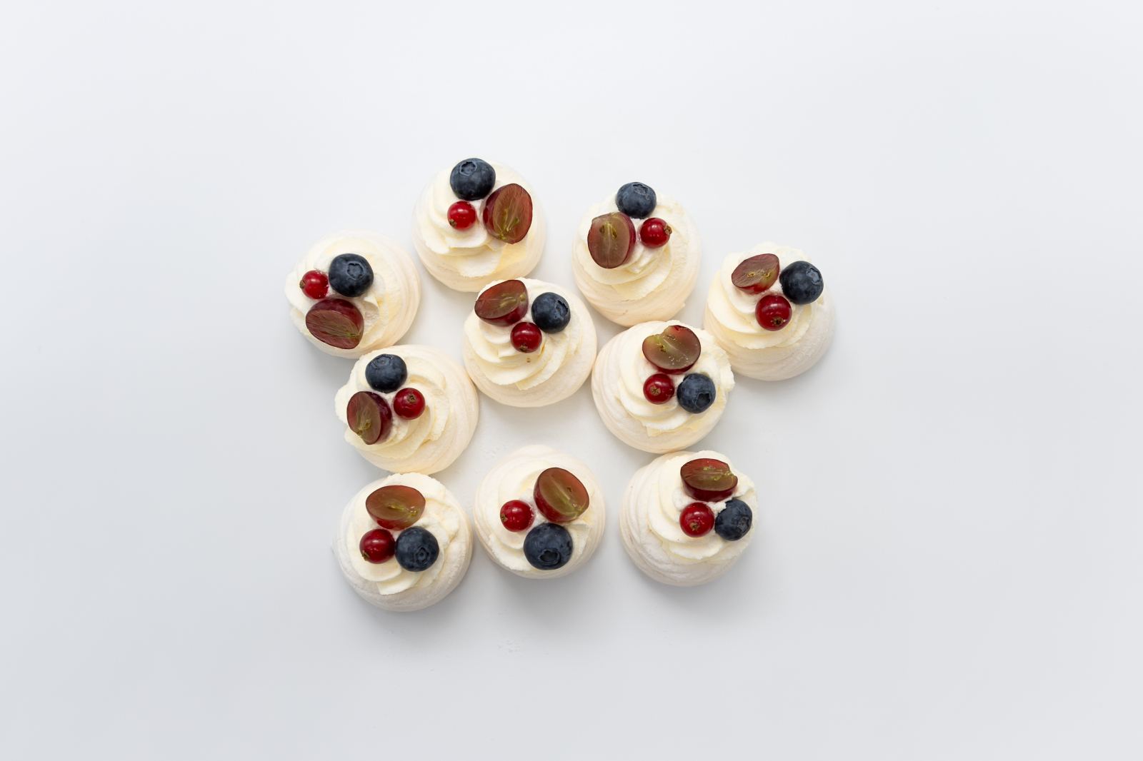 Bezea crocantă, umplută cu cremă de vanilie și frișcă, decorată cu un mix proaspăt de fructe.