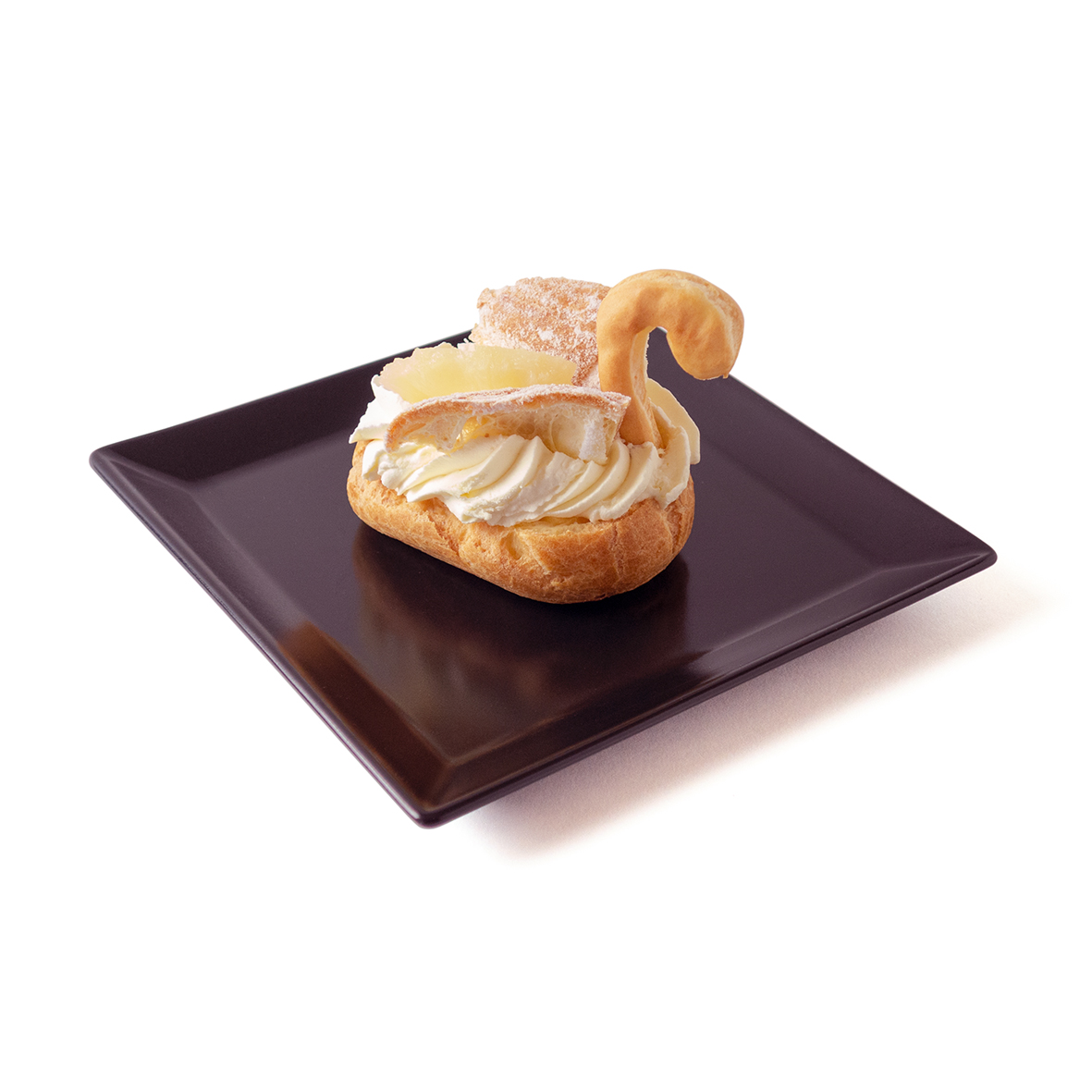 Prăjitura tip choux în formă de lebădă are un corp ușor pufos și crocant, realizat din aluat de choux (același folosit pentru eclere), cu o formă elegantă de lebădă. Coaja exterioară este aurie și fină, având o textură crocantă, iar gâtul lebedei este subțire, iar capul este o mică cupă de aluat.